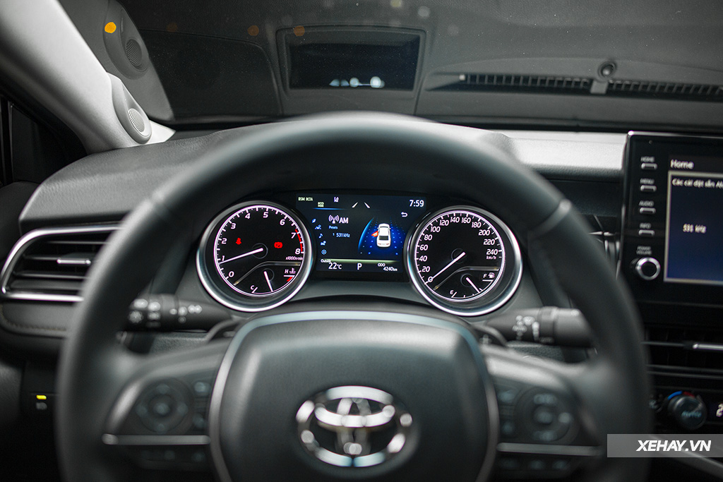 Phía bên dưới, sau tay lái là cụm đồng hồ vòng tua và tốc độ thiết kế classic, đi kèm với một màn hình đa thông tin ở chính giữa, giúp cho việc theo dõi tình trạng vận hành của xe rất tiện lợi và trực quan, đặc biệt là các tính năng hỗ trợ an toàn thông minh nằm trong gói công nghệ TSS.