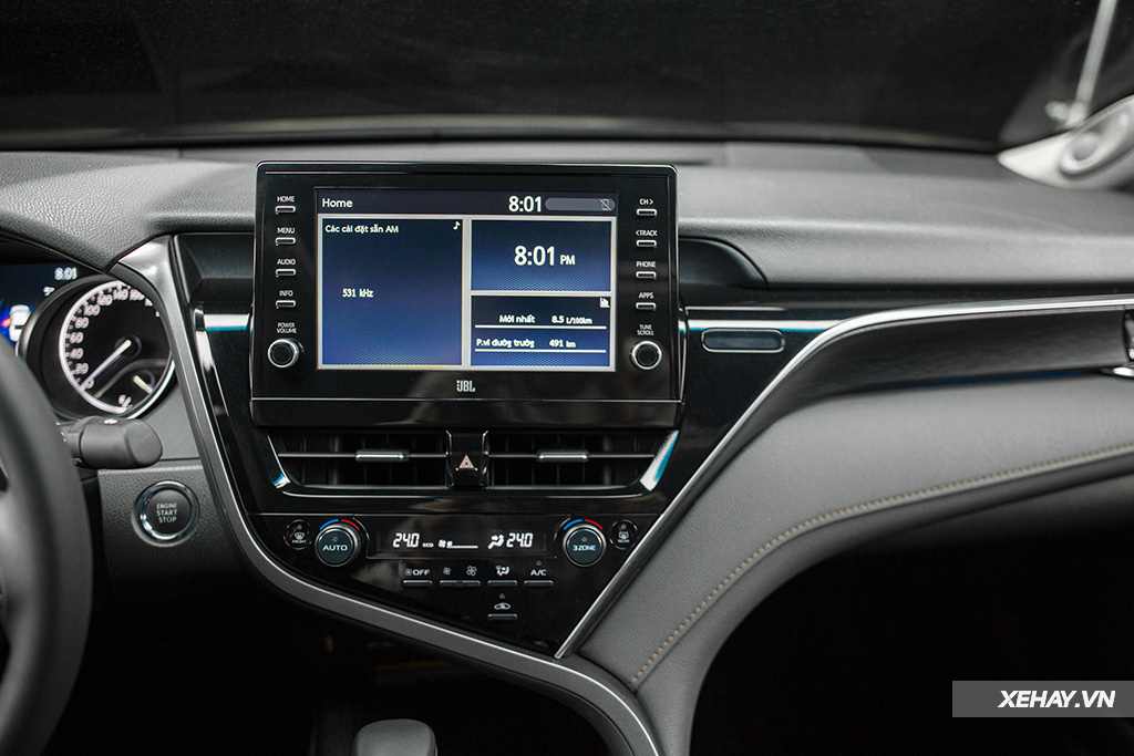 Toyota Camry 2022 cũng được nhà sản xuất trang bị đầy đủ các tính năng “ăn chơi” bao gồm: màn hình trung tâm giải trí dạng cảm ứng kích cỡ 9 inch đặt nổi trên bảng táp lô, có tích hợp kết nối không dây Apple CarPlay, Android Auto và sạc không dây. Cùng với đó là hệ thống âm thanh giải trí 9 loa JBL, đáp ứng đầy đủ nhu cầu hưởng thụ của hành khách trên những hành trình.