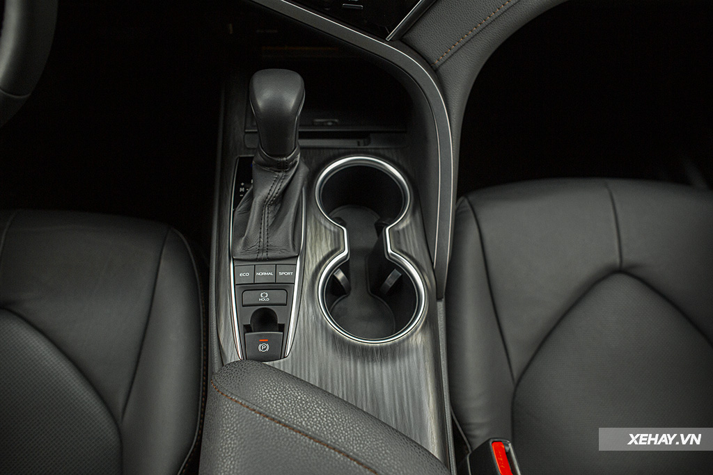Chi tiết giả ốp gỗ khu vực yên ngựa trung tâm xung quanh cần số và nút phanh tay điện tử là điểm nhấn làm toát lên không gian sang trọng và cao cấp của xe. Cửa sổ trời trên trần xe cũng giúp cho không gian bên trong Camry thoáng đãng và đón nhiều ánh sáng hơn. Cùng với đó, xe được trang bị hệ thống điều hòa tự động với tới 3 vùng khí hậu riêng biệt dành cho người lái, vị trí ghế phụ và những hành khách ở hàng ghế bên dưới.